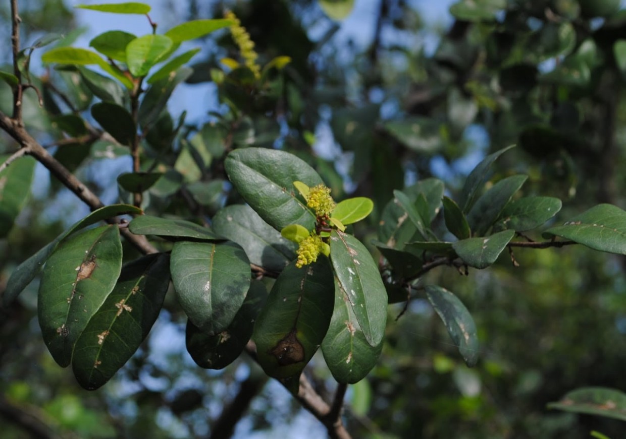 Floração varia conforme a região: Outubro-maio (setembro-fevereiro). Frutificação janeiro-junho. Inflorescências em espigas terminais de até 7cm de comprimento com flores pequenas amareladas. Flores masculinas com 3 estames; flores femininas tricarpelares. Fruto cápsula do tipo tricoca.
