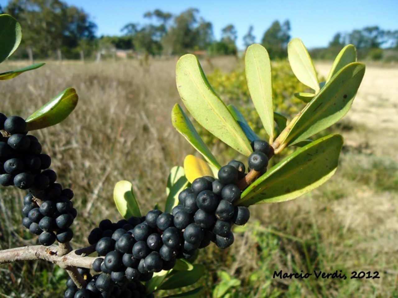 Floração durante os meses de dezembro-janeiro / junho-julho. Frutificação março-dezembro. Inflorescências em feixes axilares curtos, simulando caulifloria. Flores amarelo-esverdeadas, pentâmeras, unissexuais pequenas. Frutos do tipo drupa, esféricas de até 6,5mm de diâmetro de cor roxa.
