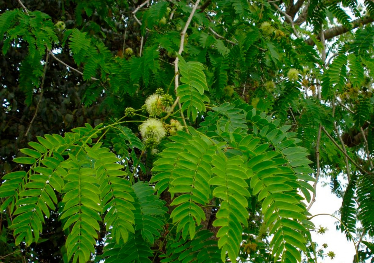 Árvore caducifólia de grande porte atingindo até 40m de altura e até 3m de diâmetro do fuste. O fuste é curto quando plantada isoladamente, e longo quando no interior da floresta. Casca lisa cinzenta com grande quantidade de lenticelas. Folhas compostas bipinadas com 3 a 7 pares de pinas, cada uma com 8 a 23 pares de folíolos. Folhas de até 30cm de comprimento. Folíolos discolores assimétricos de até 25mm de comprimento.